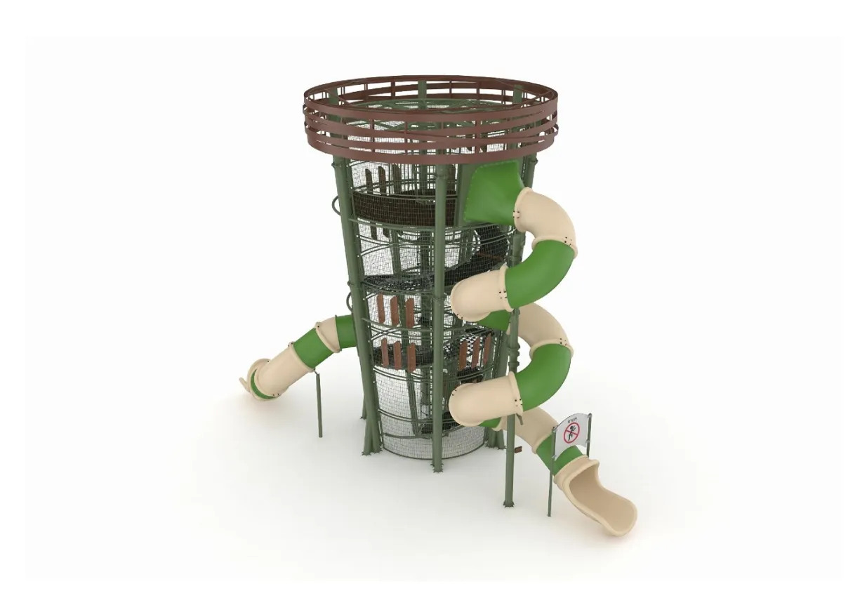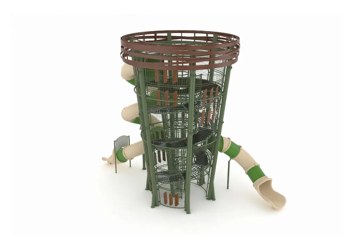 The Aviary Apex climber features a towering steel framework crowned with a spiral playground slide, inviting children to reach new heights and experience thrilling movement. Young climbers can ascend through two exciting routes—a winding outer rope course or a central rubberized rope climb—each offering varying levels of difficulty to accommodate different skill levels and abilities.