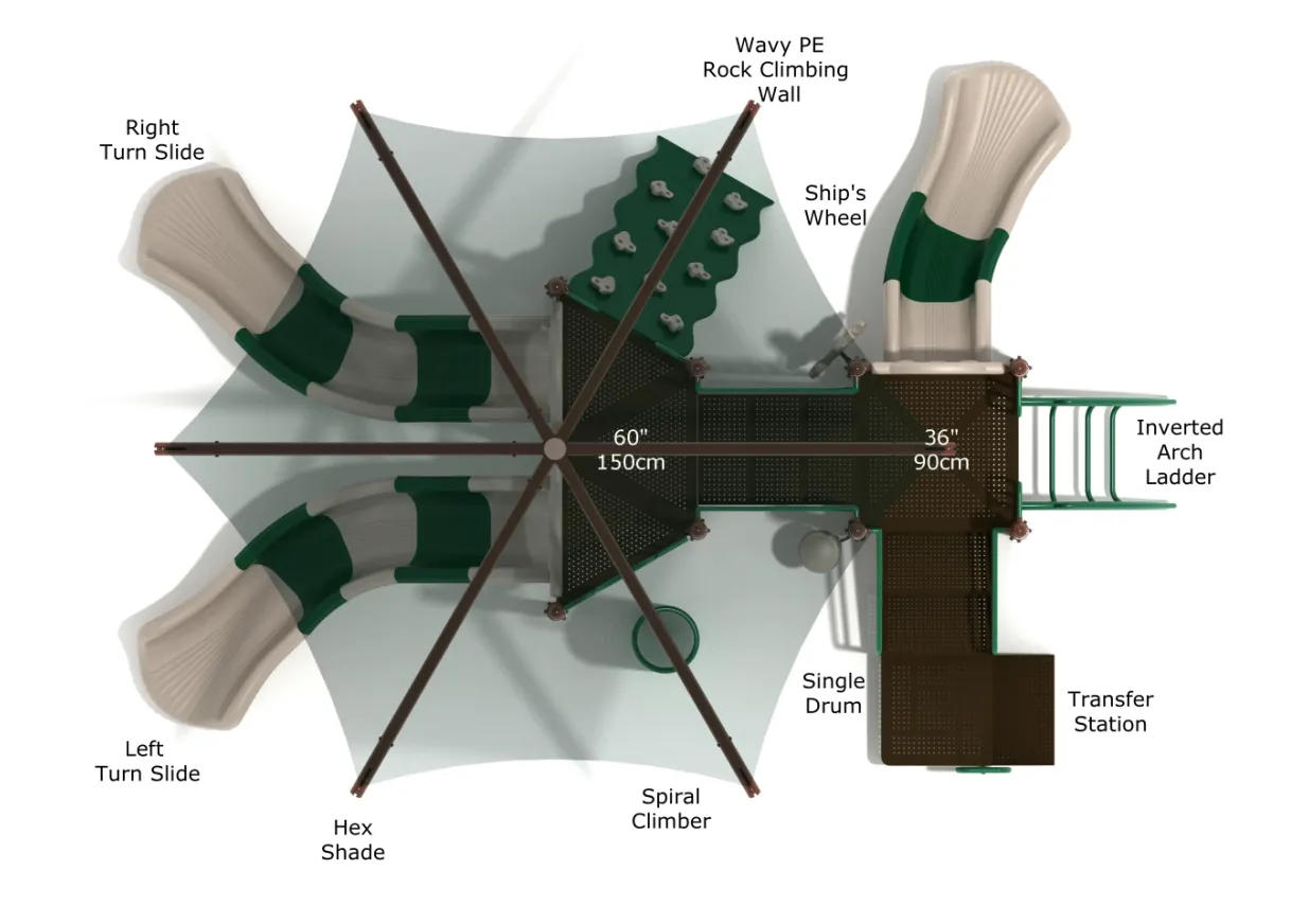 Beneath the shade, the Freedom Falls offers a variety of exciting slides and challenging climbers to keep kids active and engaged. Young adventurers can test their skills on the Wavy PE Rock Climbing Wall, the Spiral Climber, or the Inverted Arch Ladder, all designed to build strength, coordination, and confidence. For a more accessible route, the ADA-compliant Transfer Station staircase ensures that children of all ages and abilities can enjoy the fun.