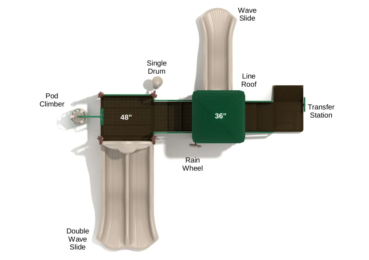 This sprawling outdoor play system features a 36-inch elevated platform connected to a 48-inch elevated platform via stairs, with access also available through the Pod Climber for a more adventurous climb. Excitement awaits with two thrilling slide options—a Wave Slide and a Double Wave Slide—giving kids a choice between solo rides or friendly races.