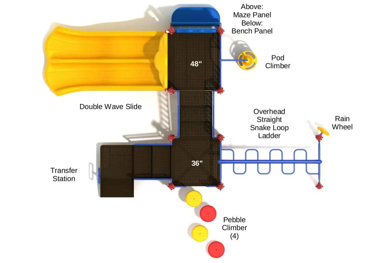 Once on the elevated deck, the fun continues. Kids can race down the Double Wave Slide in friendly competitions, or challenge their problem-solving skills at the colorful Maze Panel.