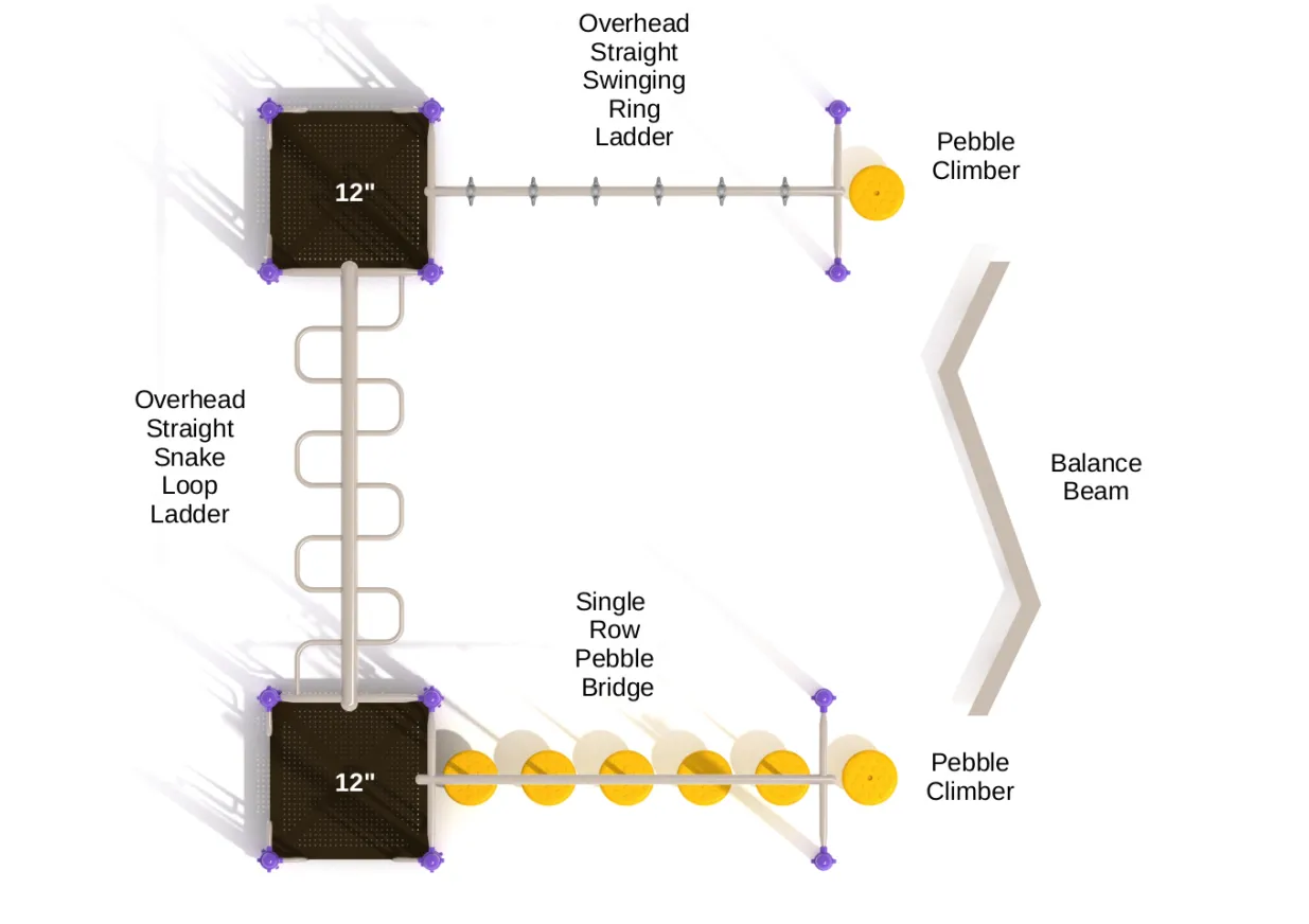 For upper body strength building, the Overhead Straight Snake Loop Ladder demands synchronized left-and-right hand movements while kids swing their bodies forward—boosting grip strength, endurance, and muscle tone. Even more thrilling is the Overhead Straight Swinging Ring Ladder, where moving rings create a dynamic climbing challenge unlike traditional monkey bars. Reaching the Pebble Climber on the far end takes skill, persistence, and plenty of determination.