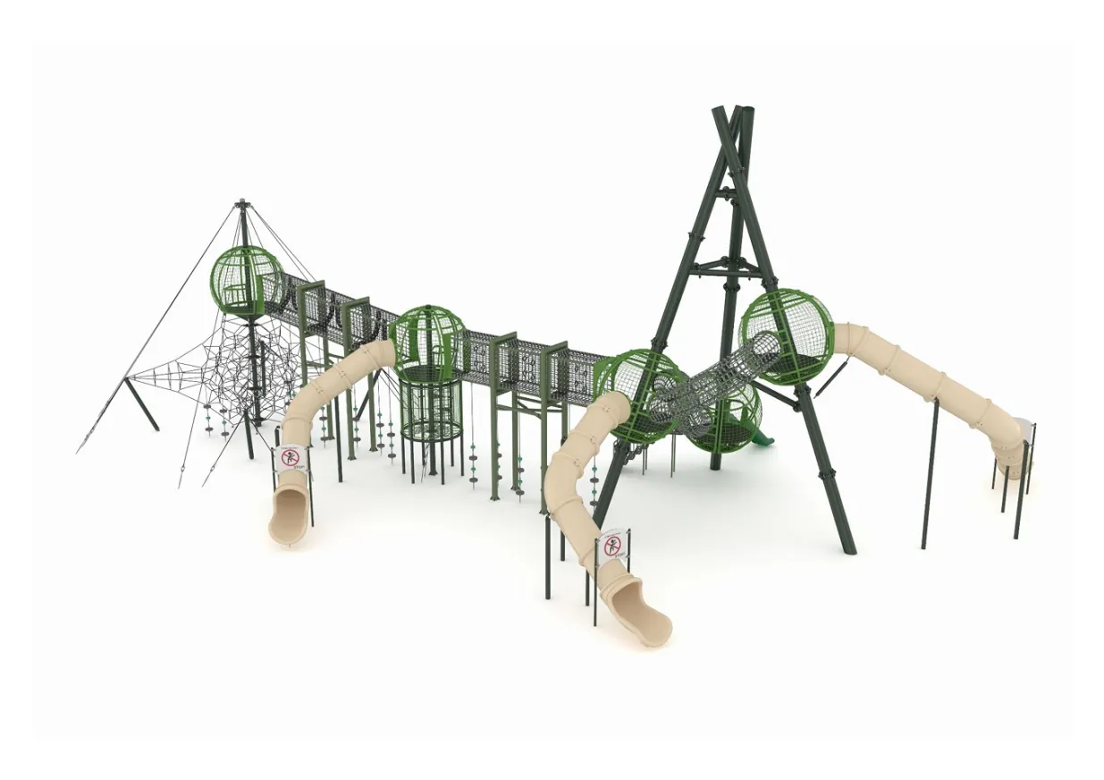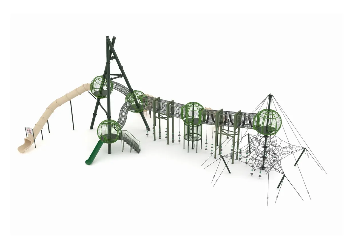 Each sphere in the Sunburst Shuttle varies in height, angle, and orientation, offering endless opportunities for imaginative play and physical development. The integrated climbing components between each sphere allow for smooth, continuous movement throughout the structure, enhancing balance, coordination, strength, and motor skills.