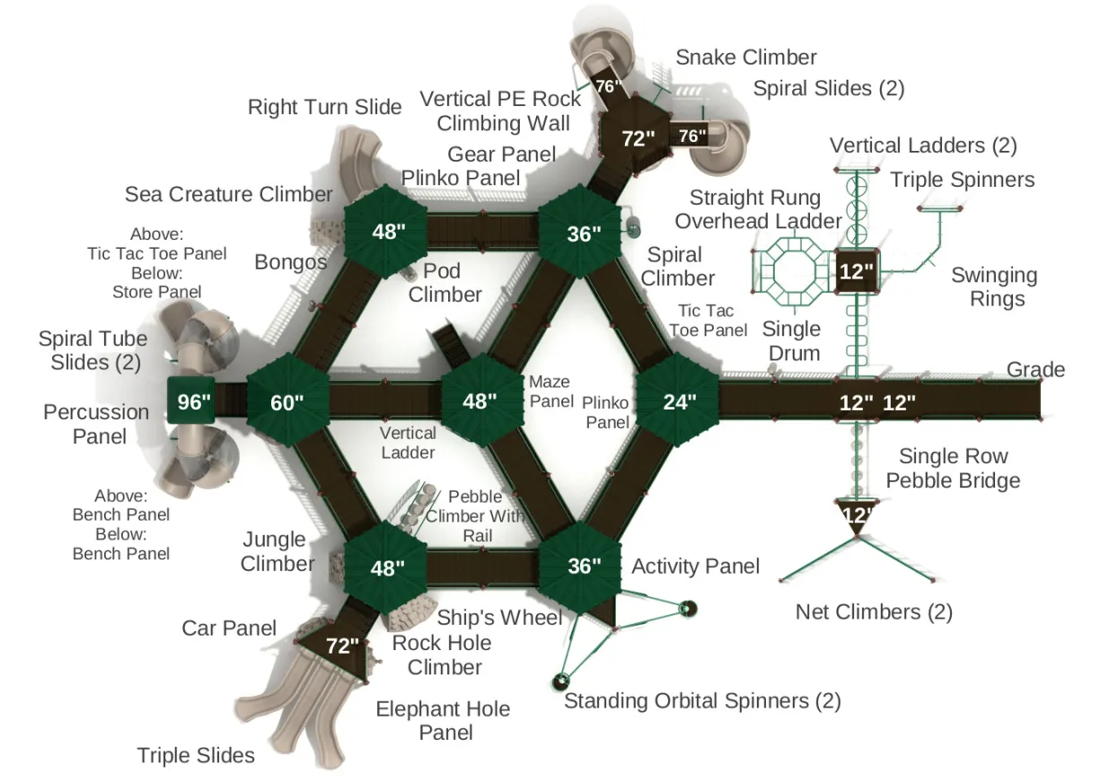 Multiple Spiral Slides, Net Climbers, and Orbital Spinners for adventure play