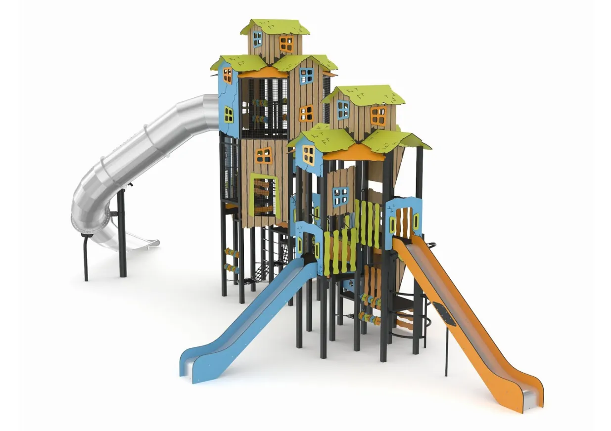 Constructed from durable, weather-resistant materials and finished with powder-coated steel components, the Wildwood Workshop Playground Structure is built to withstand heavy use and changing outdoor conditions. Its vibrant, storybook design makes it a favorite among children and an eye-catching feature for any commercial playground project.