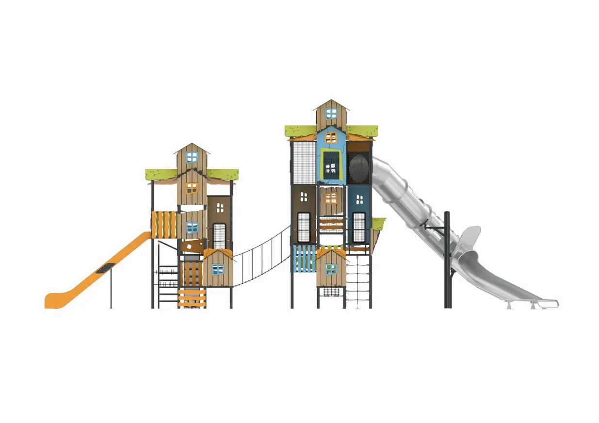 Designed to inspire imaginative and active play, the Wildwood Workshop play system features multiple elevated platforms, climbing stations, rope bridges, slides, and interactive play panels. Each level invites kids to explore, climb, and engage in different ways—promoting strength building, balance, coordination, and motor skill development through play. The varied floor levels and platform heights offer endless opportunities for discovery, teamwork, and creative storytelling.